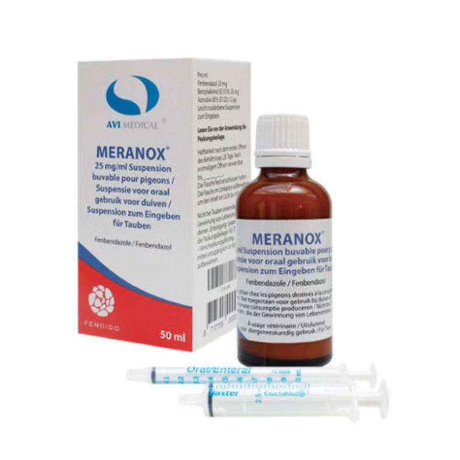 Meranox van Avimedical is ontwormingsmiddel voor duiven en pluimvee en dient oraal toegediend te worden. Het bestrijdt de rondworm en haarworm. Niet toedienen tijdens de rui- en legperiode of bij dieren bedoeld voor humane consumptie.