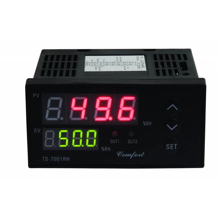 Luchtvochtigheid kan ingesteld worden in procenten, het schakelverschil is instelbaar per 0.1% en de vochtigheid kan gekalibreerd worden.