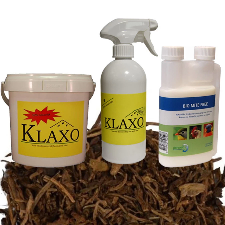 De witkalk zorgt er voor dat de aanwezige roofmijten zullen sterven en de nestmogelijkheid beperkt wordt door het vullen van naden kieren. De Klaxo spray is er voor om snel en gemakkelijk de witkalk laag bij te houden. De tabaksnippers houden uw legnesten vrijer van bloedluis dan enige andere bodembedekking en de watertoevoegig zorgt voor een bestrijding van binnen uit de kip. Zonder veel extra werk houdt u uw kippen dus vrij van bloedluis en zorgt voor een goede start in het voorjaar, u bent de bloedluis dit jaar een stap voor!
